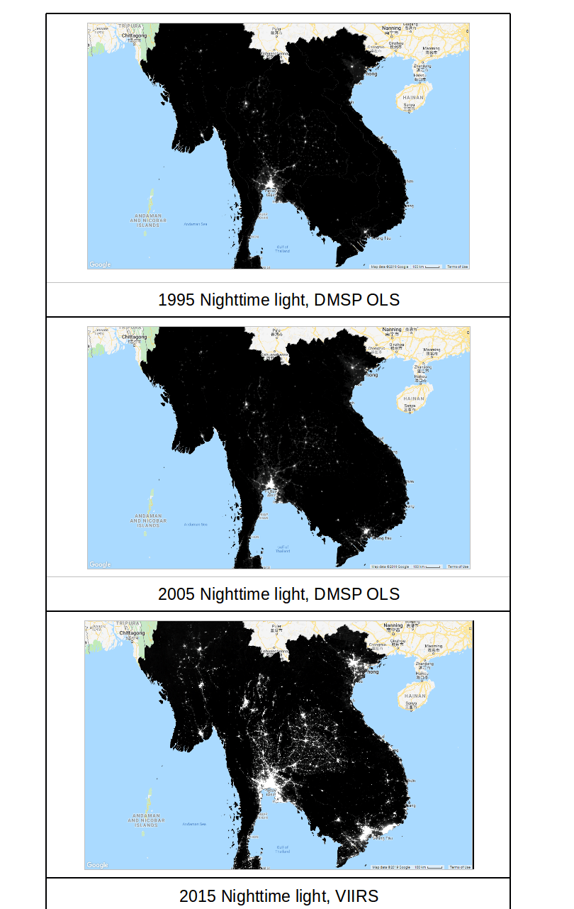 Nighttime data from the Defense Meteorological Satellite Program (DMSP) Operational Linescan System (OLS) and the Visible Infrared Imaging Radiometer Suite (VIIRS) have been widely used to monitor and analyze human activities, urban expansion and natural phenomena around the world (Hasi Bagan).