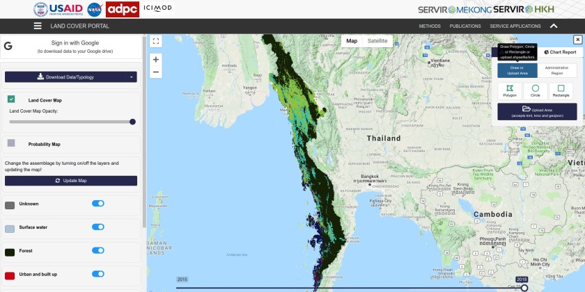 The Dawna Tenasserim Landscape covers Kayin and Mon States, and Tanintharyi Region in Myanmar. The area harbours one of the last large intact forest landscapes in the region, which hosts a large number of ethnic groups, and a wide variety of endangered wildlife such as elephants and tigers. The region is experiencing numerous threats including rapid increase in agricultural land use and associated deforestation, notably for rubber and palm oil, road and infrastructure development, and logging resulting in habitat degradation and fragmentation. The Dawna Tenasserim plantation portal shows areas with cropland, rubber, palmoil for 2017 and 2018.
