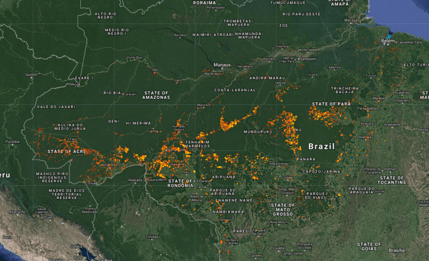 Map.addLayer(fire.clip(amazonia), {min:300,max:400,palette:['red', 'orange', 'yellow']}, 'Fires');
