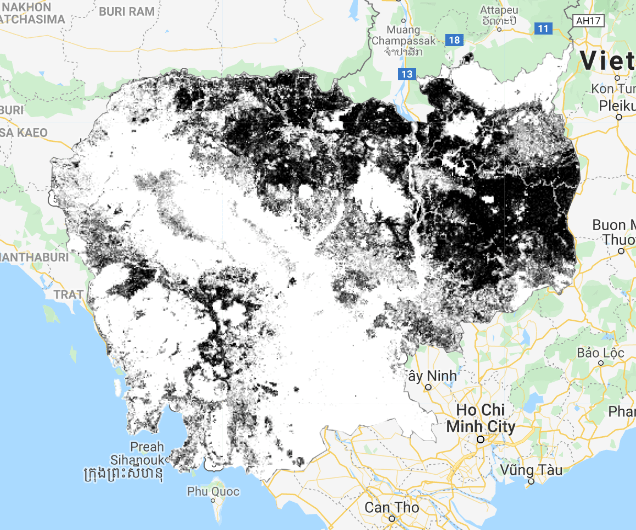 Map.addLayer(classification.clip(cambodia),{min:20,max:90,palette:"white,gray,black"},"Rubber primitive")